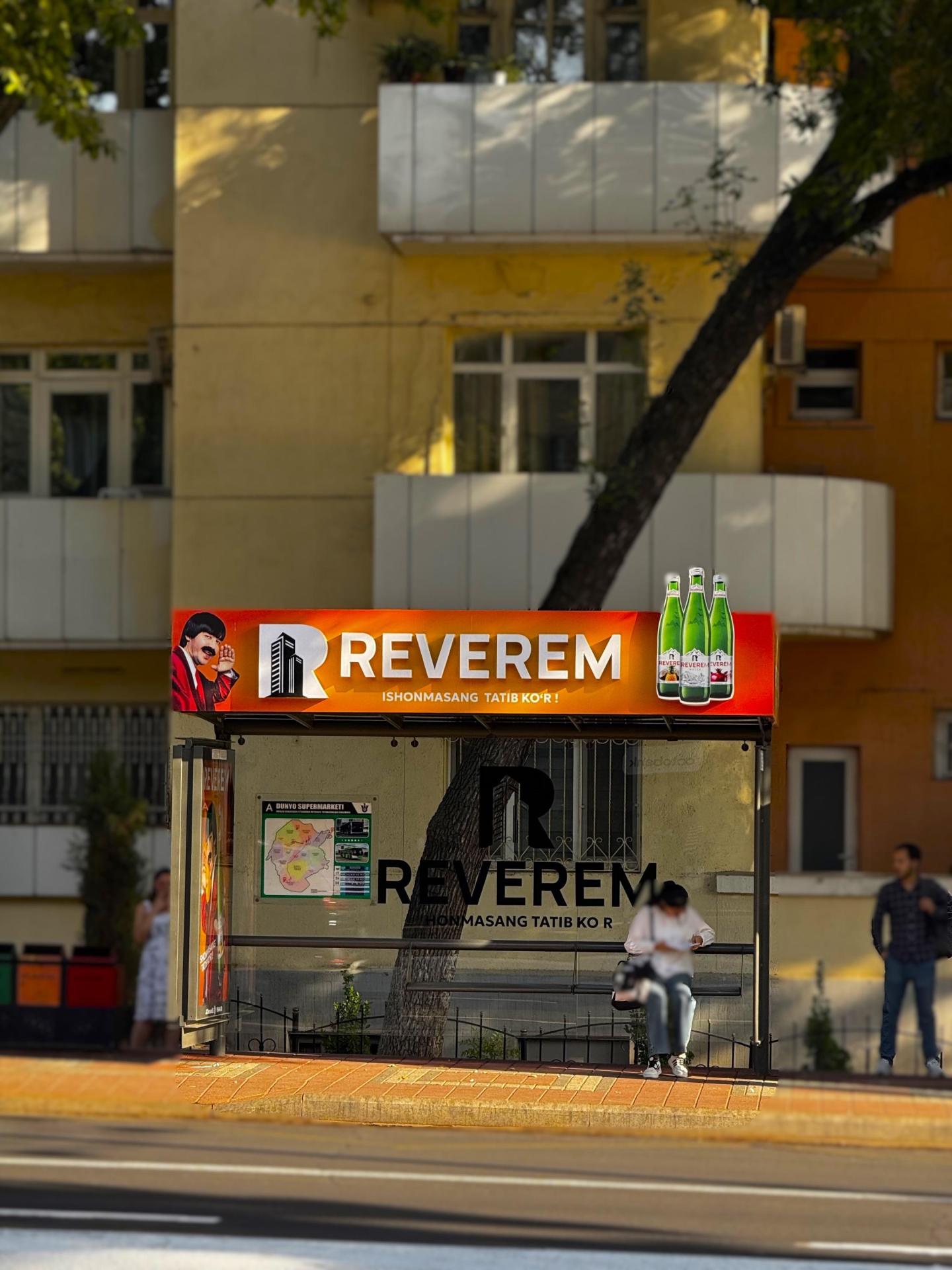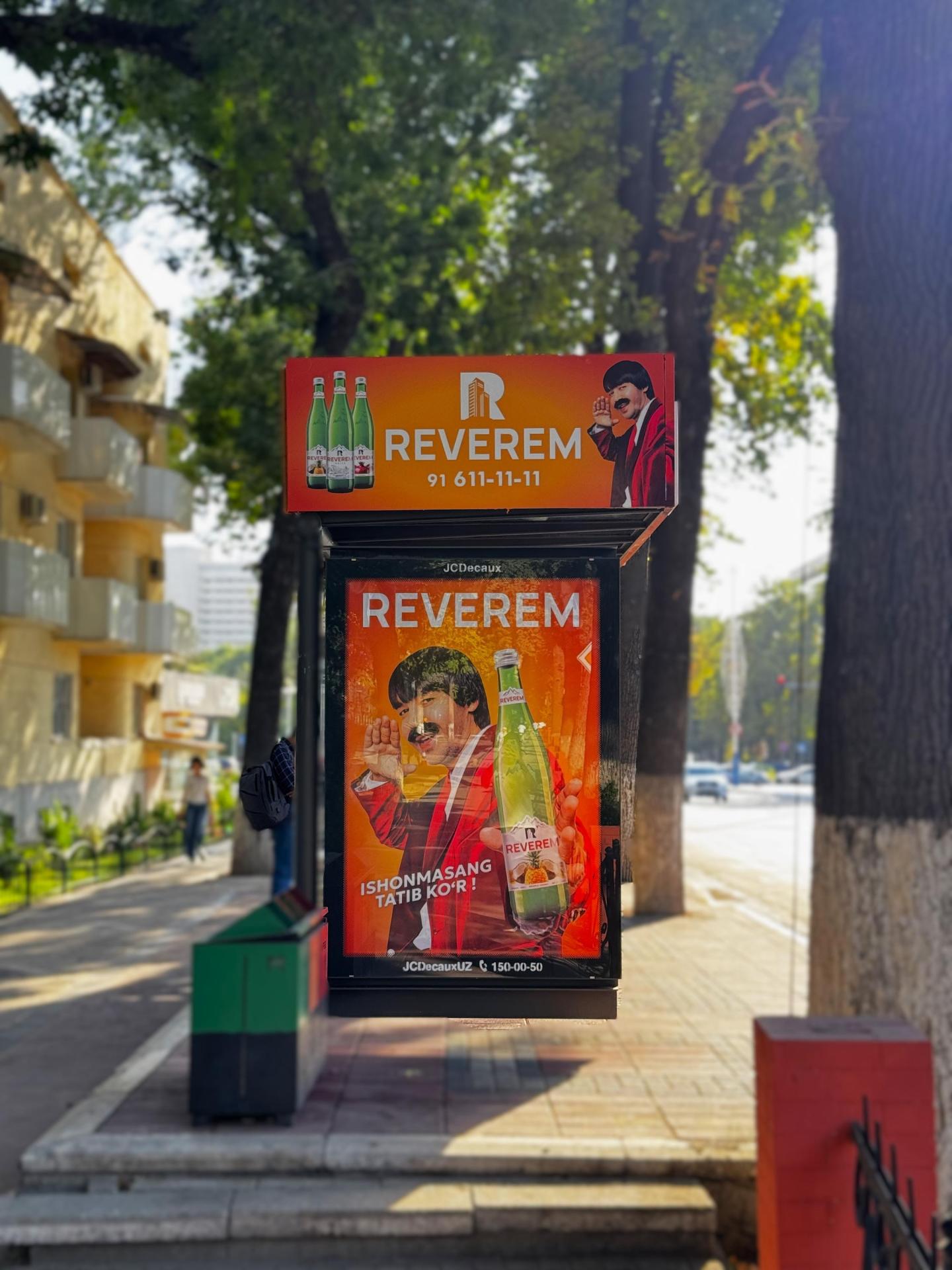 Креативная кампания Reverem в Ташкенте выделяется своим чистым, освежающим дизайном и ярким присутствием на одной из самых оживлённых улиц города.